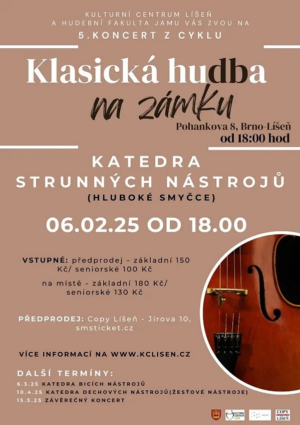 Klasická hudba na zámku – Katedra strunných nástrojů Čtvrtek 6. 2. 2025 od 18 hodin v Obřadní síni zámku Belcredi,Pohankova 8, Brno-Líšeň Projekt Přij...
