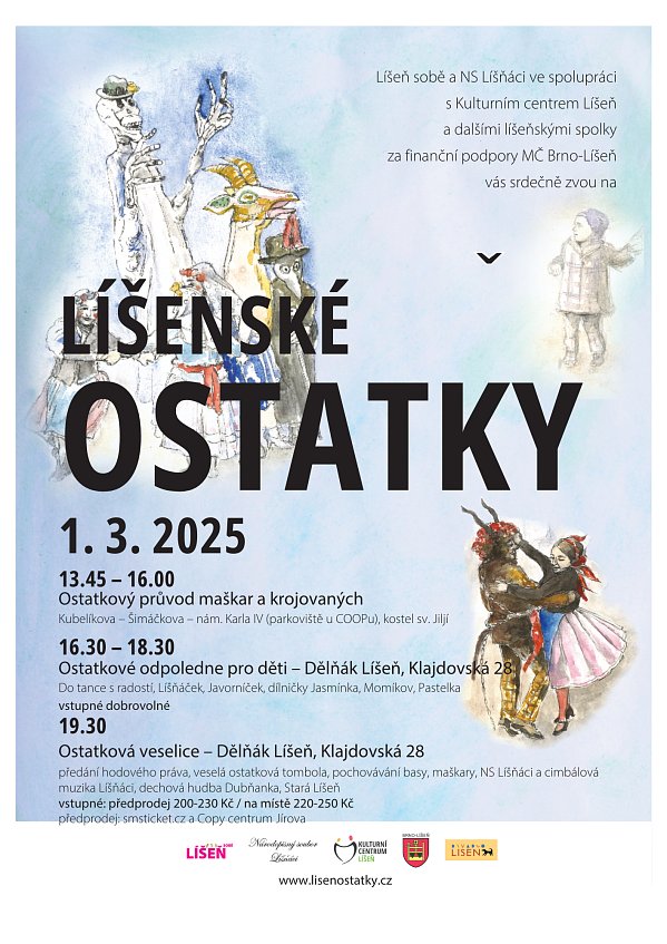 Sobota 1. 3. 2025průvod Líšní, další program v Dělňáku LíšeňVstupné: v předprodeji 200 – 230 Kč, na místě 220 – 250 Kč