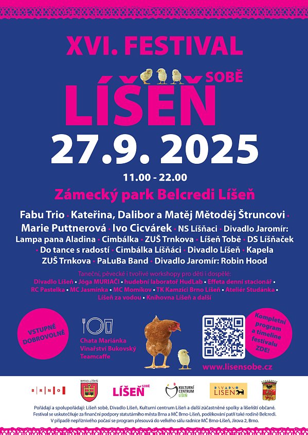 srdečně Vás zveme na XVI. ročník festivalu Líšeň sobě, který se uskuteční v sobotu 27. 9. 2025 od 11:00 do 22:00 v Zámeckém parku Belcredi v Líšni.